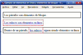 Por ejemplo, un párrafo sería un elemento block (no podemos tener un párrafo al lado del otro, sino que dos párrafos seguidos aparecerán uno abajo del otro. En cambio, un enlace es un elemento inline, ya que no “corta” el texto donde se encuentra..