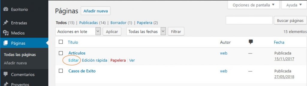 Si se desea hacer cambios en una determinada página, ya sea en su contenido textual o en componentes gráficos o de video, debemos ir a la sección Páginas de WordPress y seleccionar la opción EDITAR sobre la página deseada