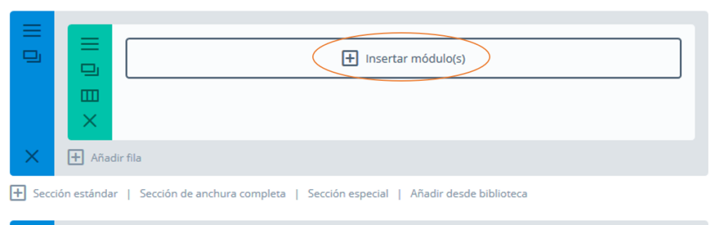 • Sección: Se reconocen por ser de color azul o moradas. Las de color azul permiten manejar una o varias columnas, mientras que la morada solo maneja ancho completo de la página sin posibilidad de columnas.