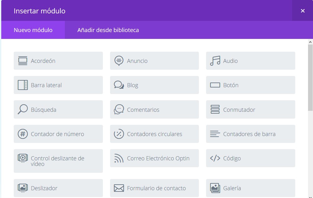 4. Seleccionamos el módulo a insertar: puede ser texto, imagen, galería de fotos, formulario de correo, botones, etc.