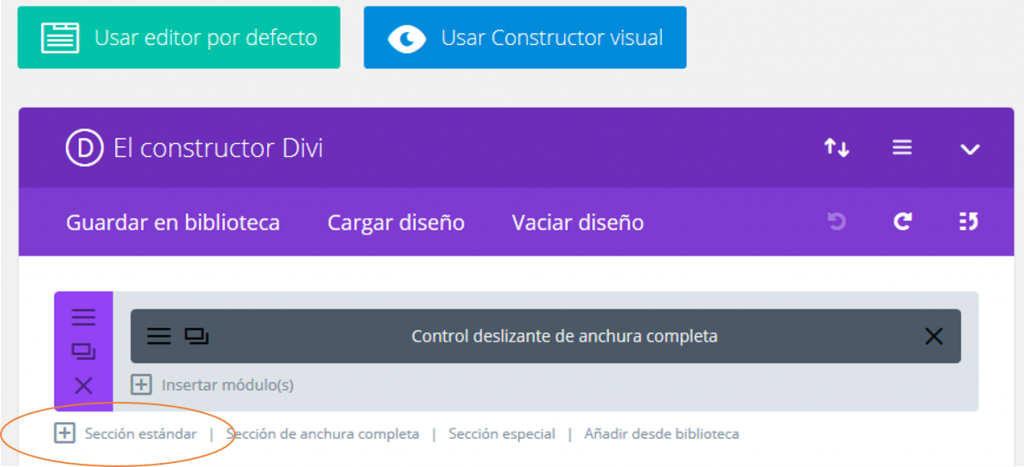 1. En el modo editar página (Backend) Seleccionamos nueva Sección Estándar